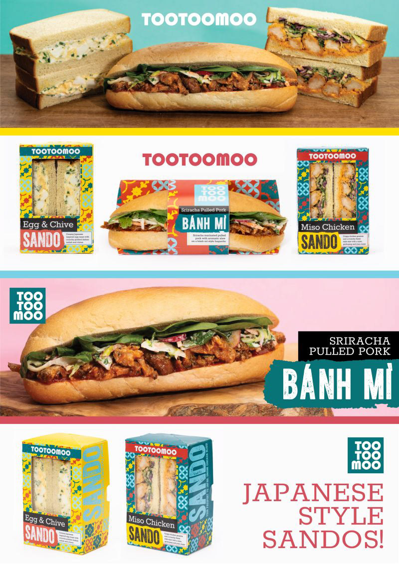 Through my current role I collaborated with Tootoomoo, a pan-Asian restaurant brand, to design packaging for three new food-to-go products launched in Sainsbury’s: two Japanese-style sandos and a pulled pork bánh mì.